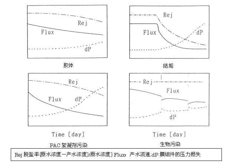 膜元件的故障原因多種多樣,比較具有代表性的是膜劣化和污染。以下介紹根據(jù)造成污染原因物質(zhì)的種類,就性能隨時(shí)間變化的一般模型作簡(jiǎn)單介紹。
