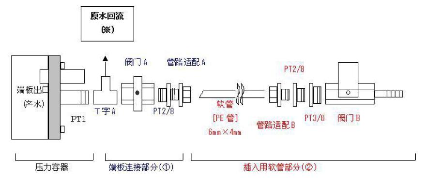 ① 端板連接部分(①)的管線安裝并固定在產(chǎn)水出口上(端板連接部分和集水管必須保持在一直線上)。端板連接部和產(chǎn)水集之間加入T型三通(T字A),為了使不從探針?lè)ㄜ浌苤型ㄟ^(guò)的產(chǎn)水回流至原水水箱。