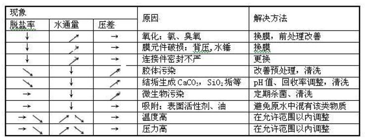 膜元件自身以外的原因表現(xiàn)出的故障癥狀往往也呈現(xiàn)在膜元件上。因此調(diào)查原因時(shí),往往總是把注意力集中在對(duì)膜性能分析上。在發(fā)現(xiàn)膜系統(tǒng)發(fā)生故障時(shí),通過(guò)對(duì)運(yùn)行記錄的查閱和原水水質(zhì)的分析,對(duì)取得正確判斷是不可缺少的。