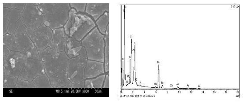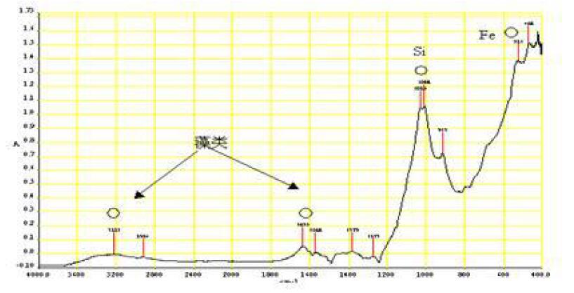 附著的元素和用FT-IR所得的化合物吸收對(duì)應(yīng)組合,可以推斷附著物。例如通過(guò)XMA,看出有Si、Fe的附著,SEM發(fā)現(xiàn)藻類物質(zhì),用 FT-IR發(fā)現(xiàn)有Si、Fe和藻類的吸收光譜,參考標(biāo)準(zhǔn)的頻譜,可以判定有Si、Fe和藻類污染的存在。參看圖5和6。